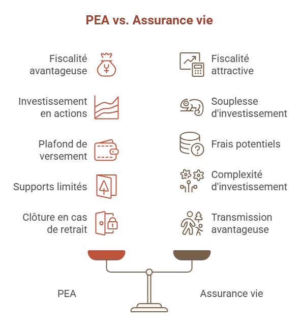 Vous hésitez entre le PEA (plan d’épargne en actions) et l’assurance-vie pour investir ? Ces deux placements figurent parmi les solutions les plus utilisées pour faire fructifier son épargne, mais ils répondent à des logiques différentes : performance boursière d’un côté, diversification et gestion patrimoniale de l’autre.